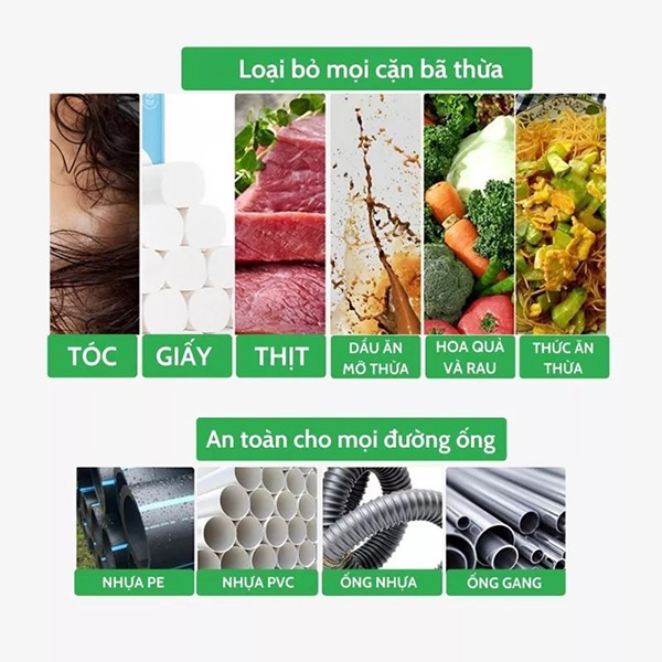 - Làm sạch sâu, phân hủy cặn bẩn, tóc, dầu mỡ, rác hữu cơ.