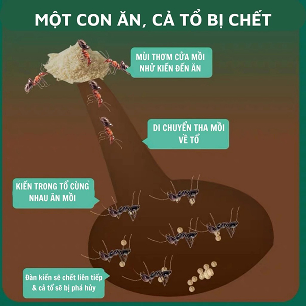 - Khi kiến ăn phải, chúng mang thức ăn về tổ chia sẻ cho đàn, giúp tiêu diệt cả kiến chúa.