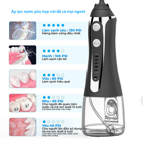 - Nước phun 1400 lần 1 phút với tia nước siêu âm, dễ dàng làm sạch mảng bám ở các kẽ răng.